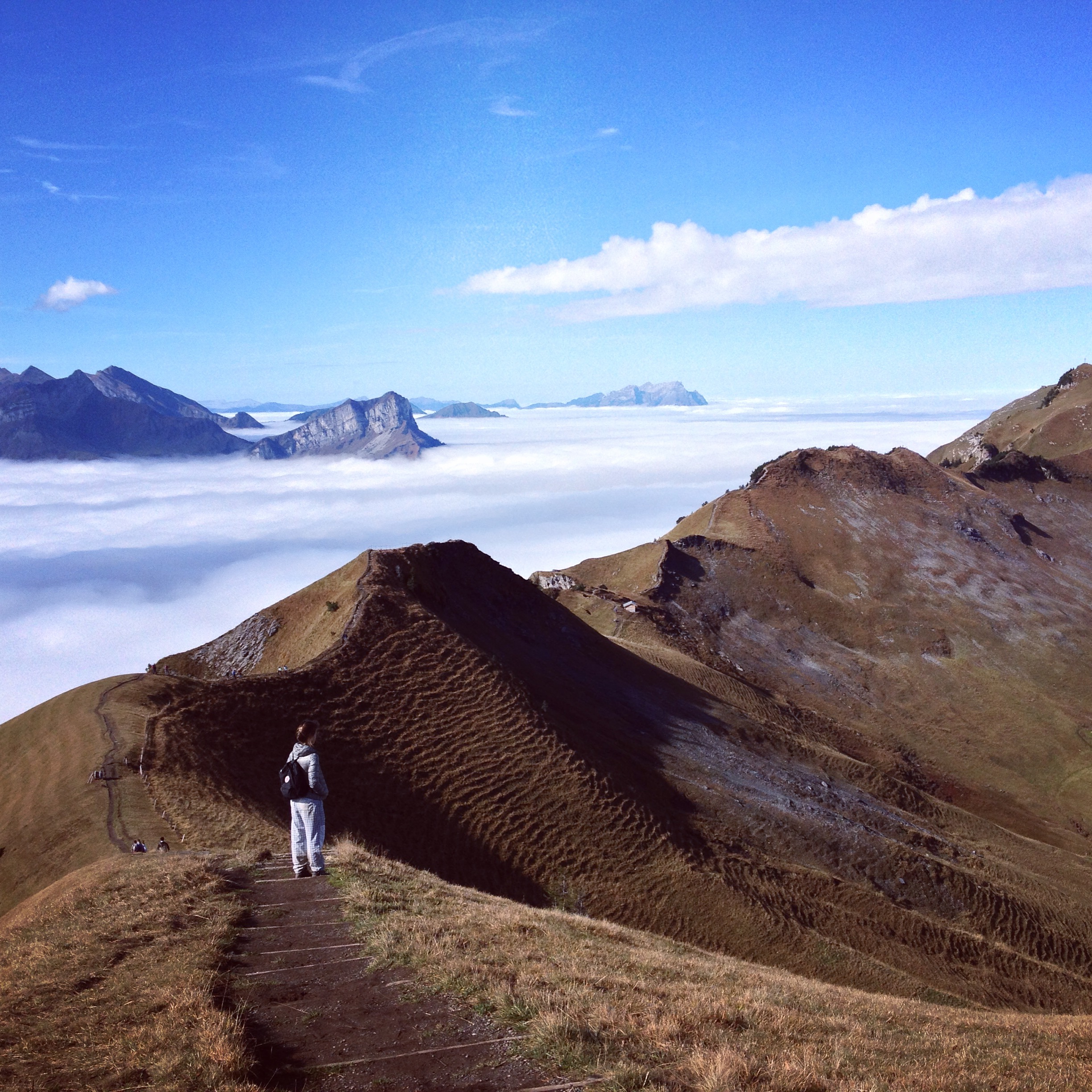 And when at some points we emerged from the thick cloud cover, then the views were just stunningly beautiful. There they were, the Swiss alps with their countless peaks glowing in the sun, covered in snow, while all the valleys were still hidden below the clouds. Most impressive was the view from the Klingenstock, where after what seemed like countless switchbacks (accompanied by the steady and mocking humming of the nearby-tough-hidden-in the fog cableway), we were rewarded with a most amazing and fun trail along the ridge and with some extra spectacular views. Kanton Schwyz, we will be back!