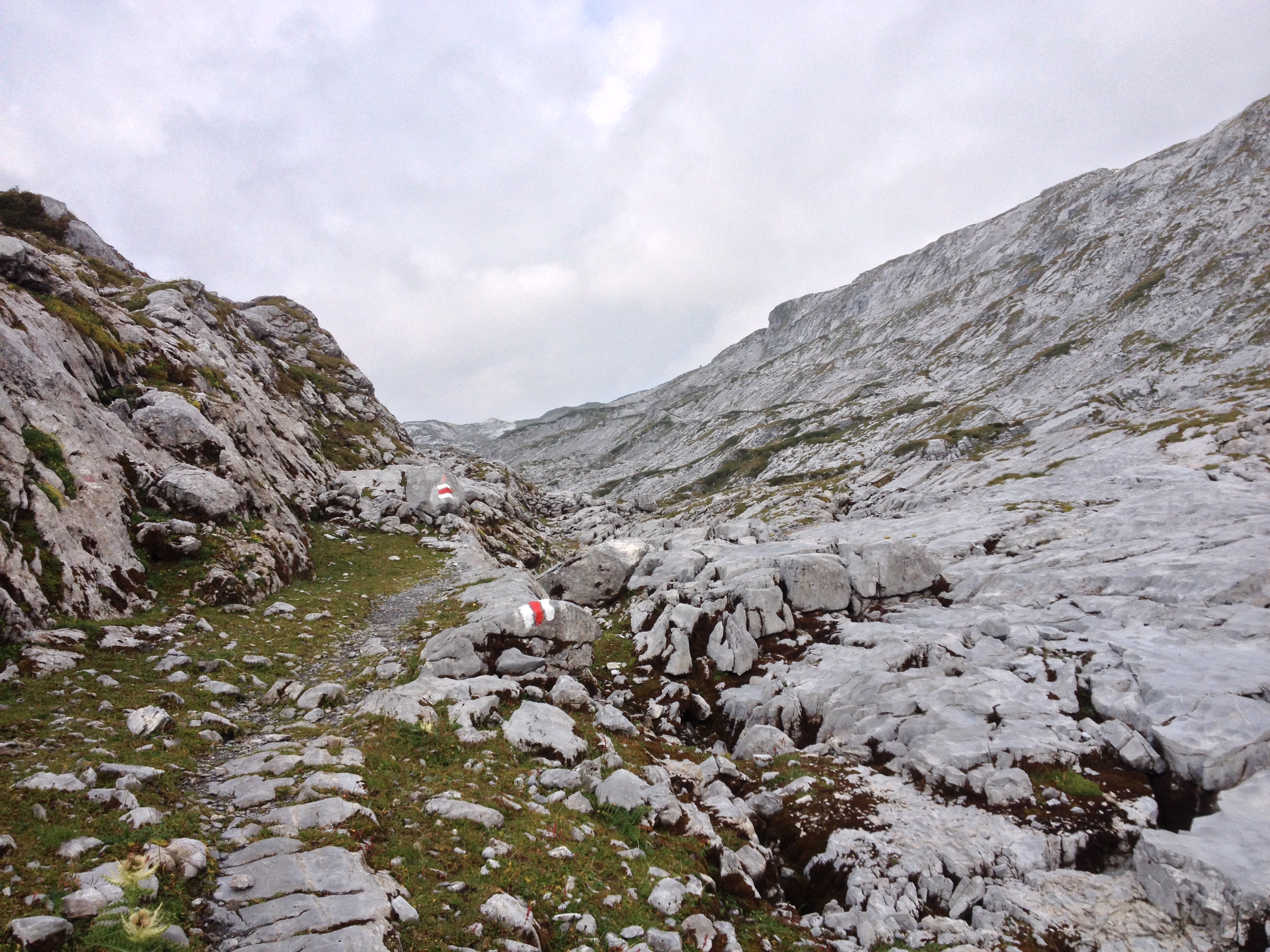 The hike starts off at Braunwald, or if you want to skimp on elevation gain a little, up at the cableway station at Gumen (1901 meters). From there you follow the tiny trail towards Klöntal, a trail that rather steeply leads you up another 300 meters of elevation up to the Bützi (2150 meters) and then on into a high valley of super rugged and stunning karst terrain.