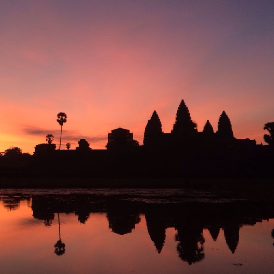 We did not want to miss out on a sunrise at Angkor Wat though. And so we found ourselves getting up at 4:30 in the morning, climbing into a tuk-tuk rather sleepy and walking towards the temple of Angkor Wat with a surprisingly large crowd. It was a superpeaceful tourist-moment though. So many people from so many different backgrounds gathered there at the foot of the temple complex, vendors selling much appreciated coffee, and everyone having their smartphones, tablets and fancy cameras at the ready, and everyone was appreciating the spectacle that Angkor Wat put on: a sunrise about as beautiful as it gets, with colours ranging from bright oranges to mild violets to kitschy pink.